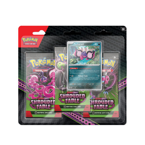 Includes three Scarlet & Violet—Shrouded Fable booster packs and one foil promo card featuring Pecharunt.