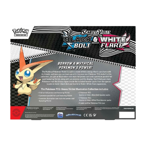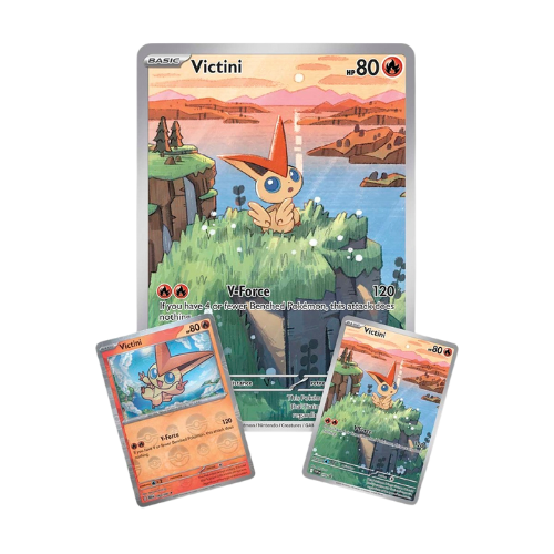 The Mythical Pokémon Victini is known for its boundless energy and the ability to share its strength with others. Now you can bring that same spark into your own decks with the Unova Victini Illustration Collection. This special set includes both foil promo versions of Victini and a stunning oversized card that makes a perfect display piece.