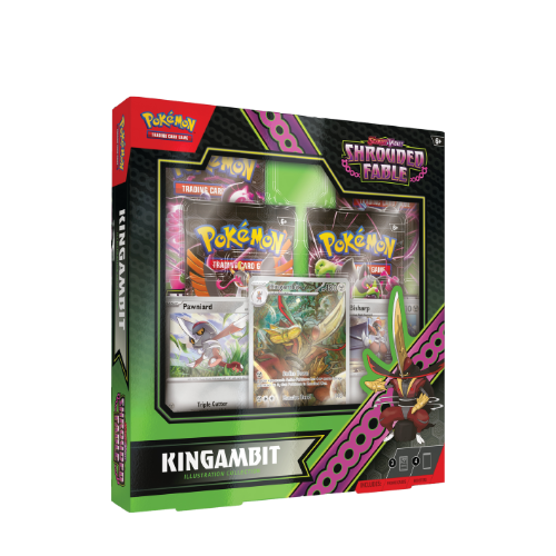 Includes four Scarlet & Violet—Shrouded Fable booster packs, one illustration rare-style promo card featuring Kingambit in a unique Ukiyo-e (woodblock) art style, and two foil promo cards featuring Pawniard and Bisharp.