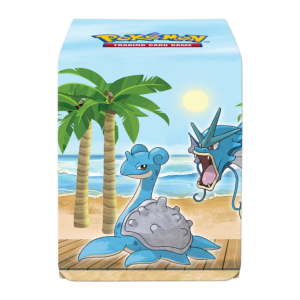 Alcove Flip Boxes for Pokémon feature a vibrant, full-color image of Gyrados, Lapras, and Magikarp in a leatherette finish; a strong magnetic closure; and dual thumb notches for easy access to your deck. This Deck Box holds up to 100 standard-size trading cards double-sleeved in Ultra PRO Deck Protector® sleeves.