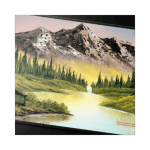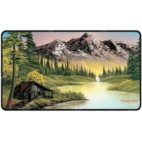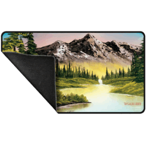 Every day can be a good day with Bob Ross tabletop accessories! Add some joy to your game space with the Mountain Retreat black stitched playmat, featuring a Bob Ross original painting of a serene wooded mountain scene at sunrise, complete with a happy little cabin. Each playmat is made with a soft fabric top to reduce damage to cards, and features black stitched edges for an extra special premium feel. The non-slip rubber backing keeps the playmat from shifting during use. With dimensions of approximately 24 in. x 13.5 in., a playmat also makes an excellent oversize mousepad for home or office.